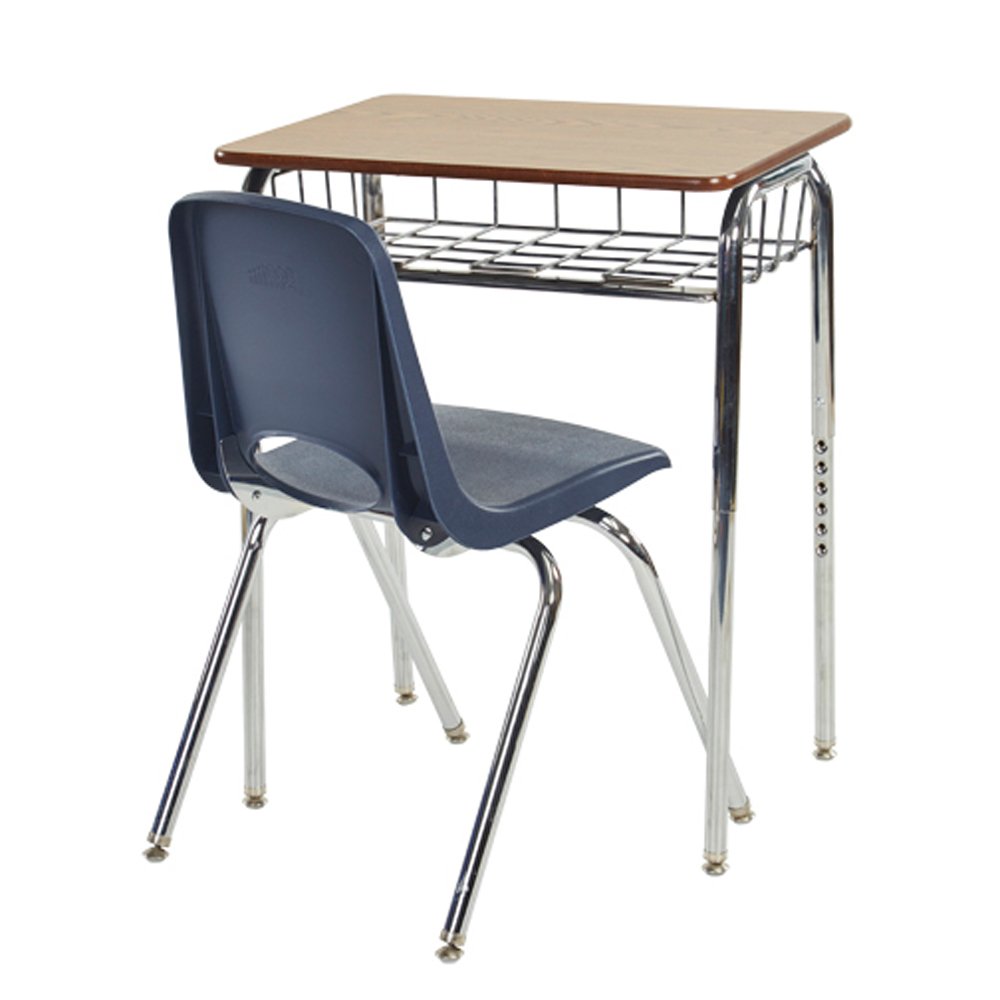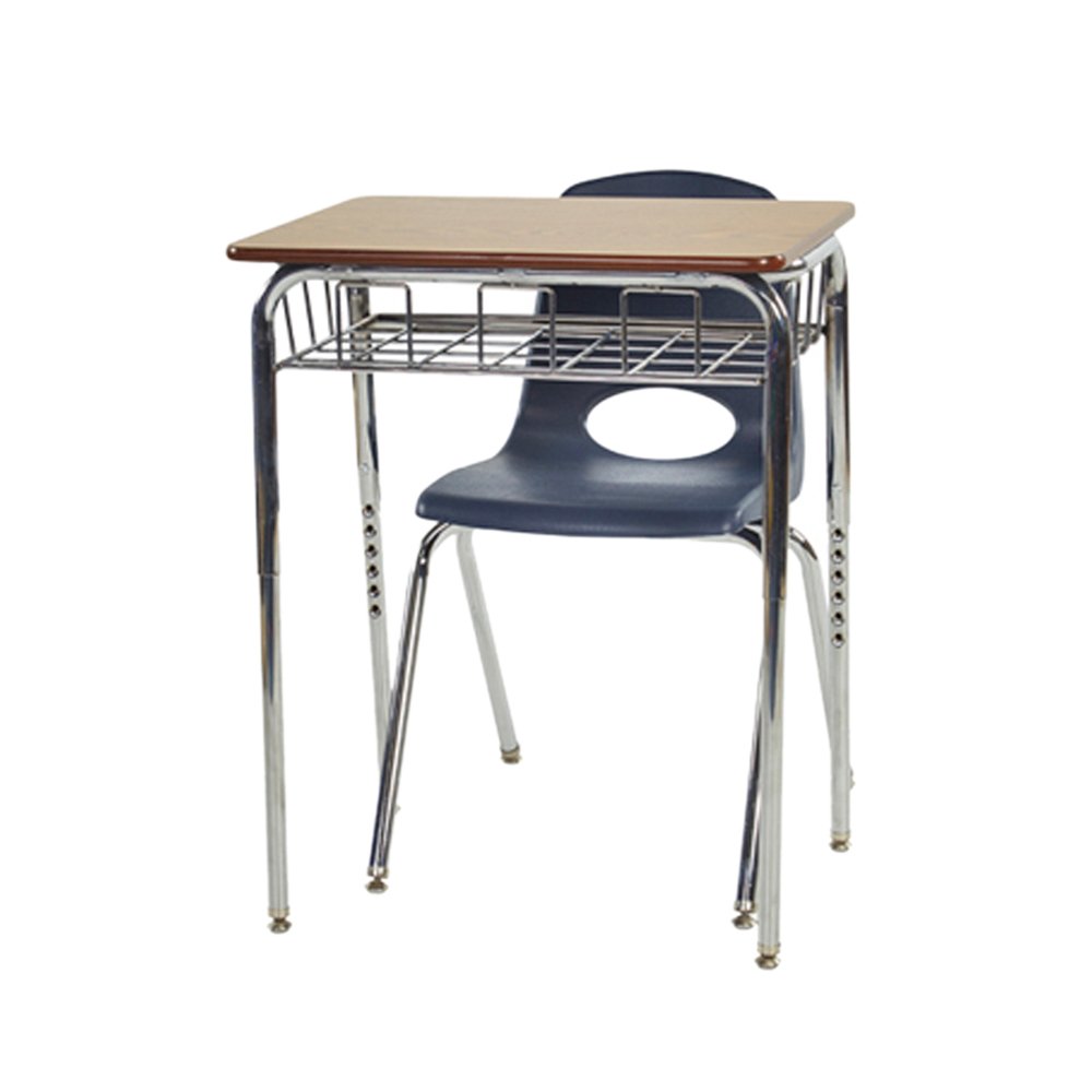 Say hello to the classic open front desk with a twist. The stylish ECR4Kids Open Front Desk with attractive chrome book basket, has an updated design for today's classrooms and homes. Store books and and supplies in the open and sturdy chrome book baskets outfitted with an indented groove to keep pencils, pens, and the like from falling on to the floor. Desk tops feature an attractive oak laminate finish with plenty of work space. Sleek chrome legs are adjustable in one inch increments from 24""H to 30.5""H. Each leg is equipped with a self-leveling nylon swivel glide to keep the ECR4Kids Open Front Desk well-adjusted under less than ideal flooring conditions.