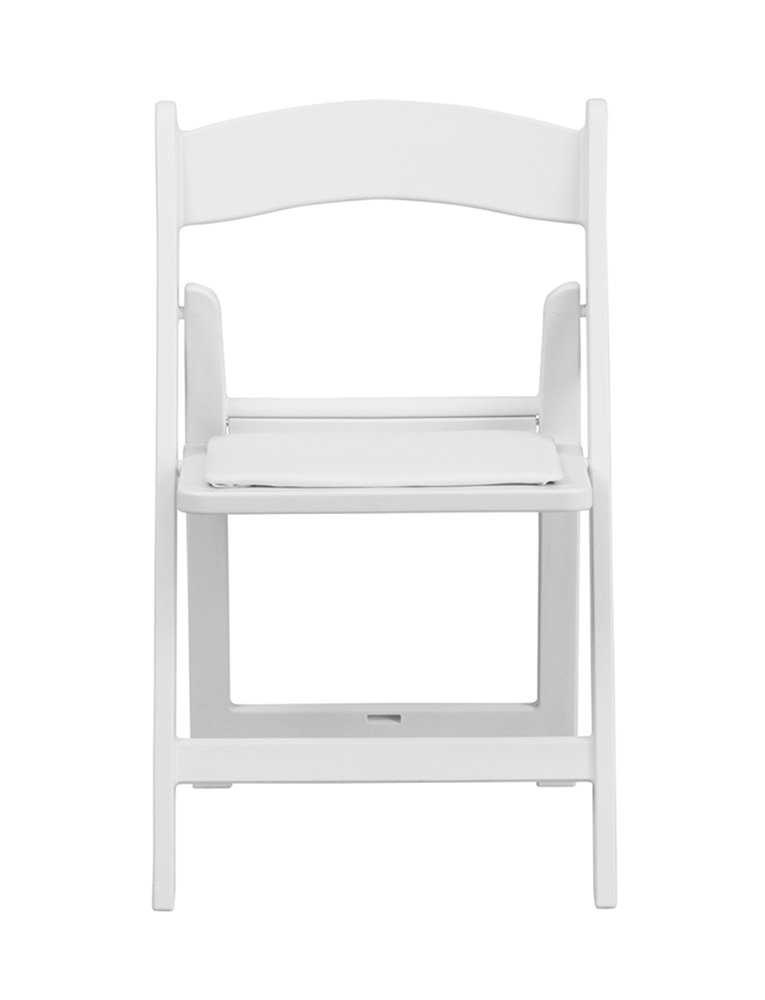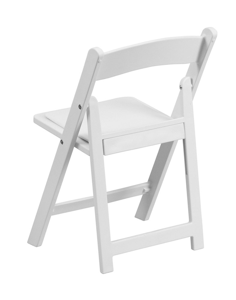 This kid sized chair will complete your venue seating needs. This chair was designed so that young kids can feel a part of the event. This beautiful chair will highlight your indoor and outdoor events. The vinyl padded seat is detachable for easy cleaning and replacement. The chair folds flat for storing after a successful event. Material: Foam, Resin, Vinyl. Color: White. Warranty: 2 year parts only.
