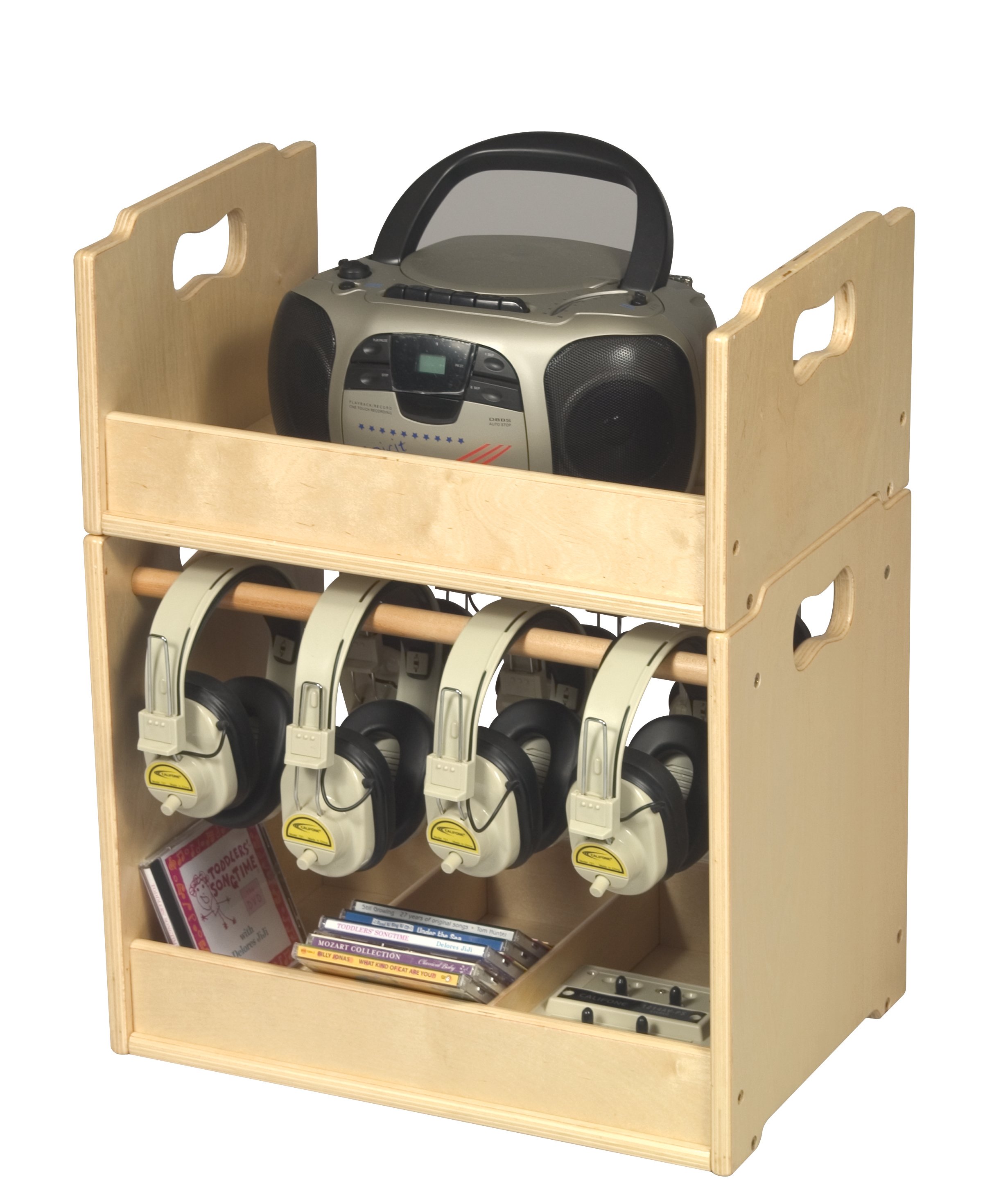This unique audio storage solution features two modular units for greater flexibility in the learning environment. One area holds a CD player or radio while the other holds headphones, CDs, DVDs, cassettes and more. Neatly stacks for storage and the natural finish will blend with any decor. Adult assembly required. Top unit measures