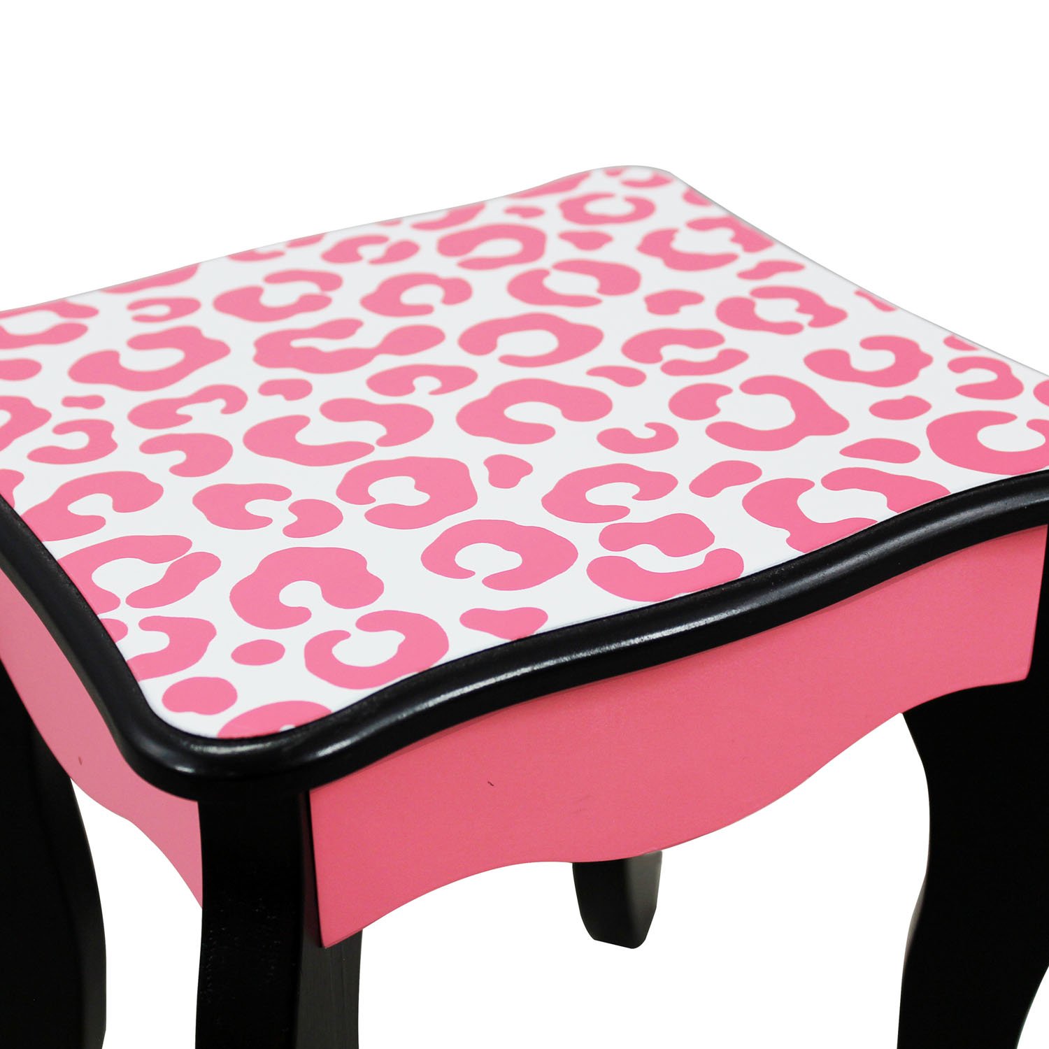 Give your diva a funky place to get beautified and indulge in the latest of fashion with the Fashion Prints Leopard Vanity & Stool Set. Gorgeous hot pink leopard print decorates the vanity for kids while black trim blends into the design. Comes with a sturdy stool and drawer space to store all of her favorite fashion accessories. Give your divas a collection of merchandise as unique as their personality with the Fashion Prints Collection. With exotic, bold patterns and colors your diva is sure to leave an impression with their new furniture pieces. Give them something to rant and rave about today and be as creative as their imaginations will take them! Care Instructions: Dry or Damp Cloth. Warranty: 30 day warranty against manufacturer defects. Assembly: Assembly required. Black and Pink Leopard Animal Prints designed by Teamson Design Corp.
