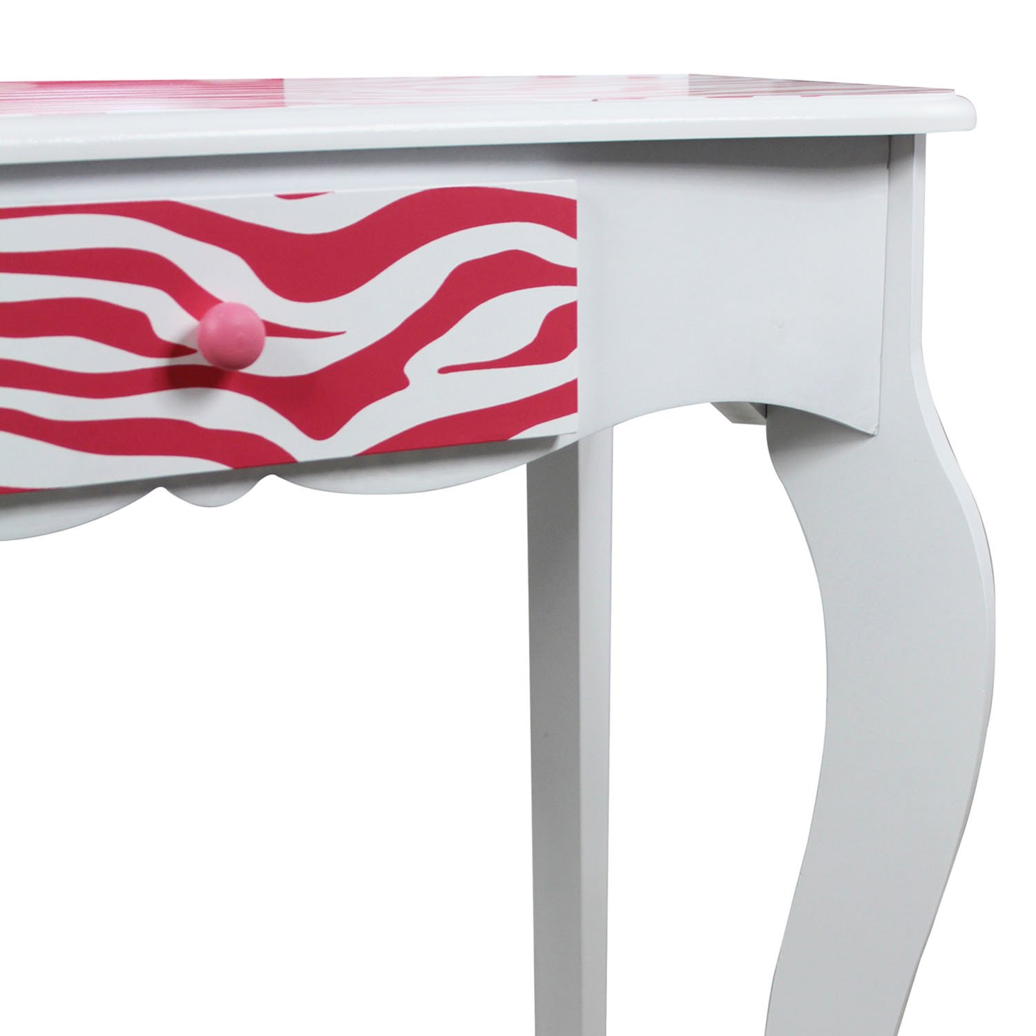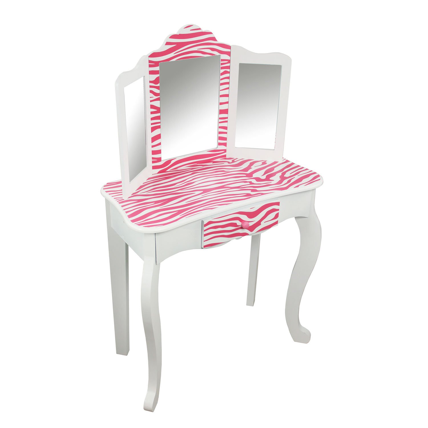 Give your diva a funky place to get beautified and indulge in the latest of fashion with the Fashion Prints Zebra Vanity & Stool Set. Gorgeous hot pink zebra print decorates the vanity for kids while white trim blends into the design. Comes with a sturdy stool and drawer space to store all of her favorite fashion accessories. Give your divas a collection of merchandise as unique as their personality with the Fashion Prints Collection. With exotic, bold patterns and colors your diva is sure to leave an impression with their new furniture pieces. Give them something to rant and rave about today and be as creative as their imaginations will take them! Care Instructions: Dry or Damp Cloth. Warranty: 30 day warranty against manufacturer defects. Assembly: Assembly required. White and Pink Zebra Animal Prints designed by Teamson Design Corp.
