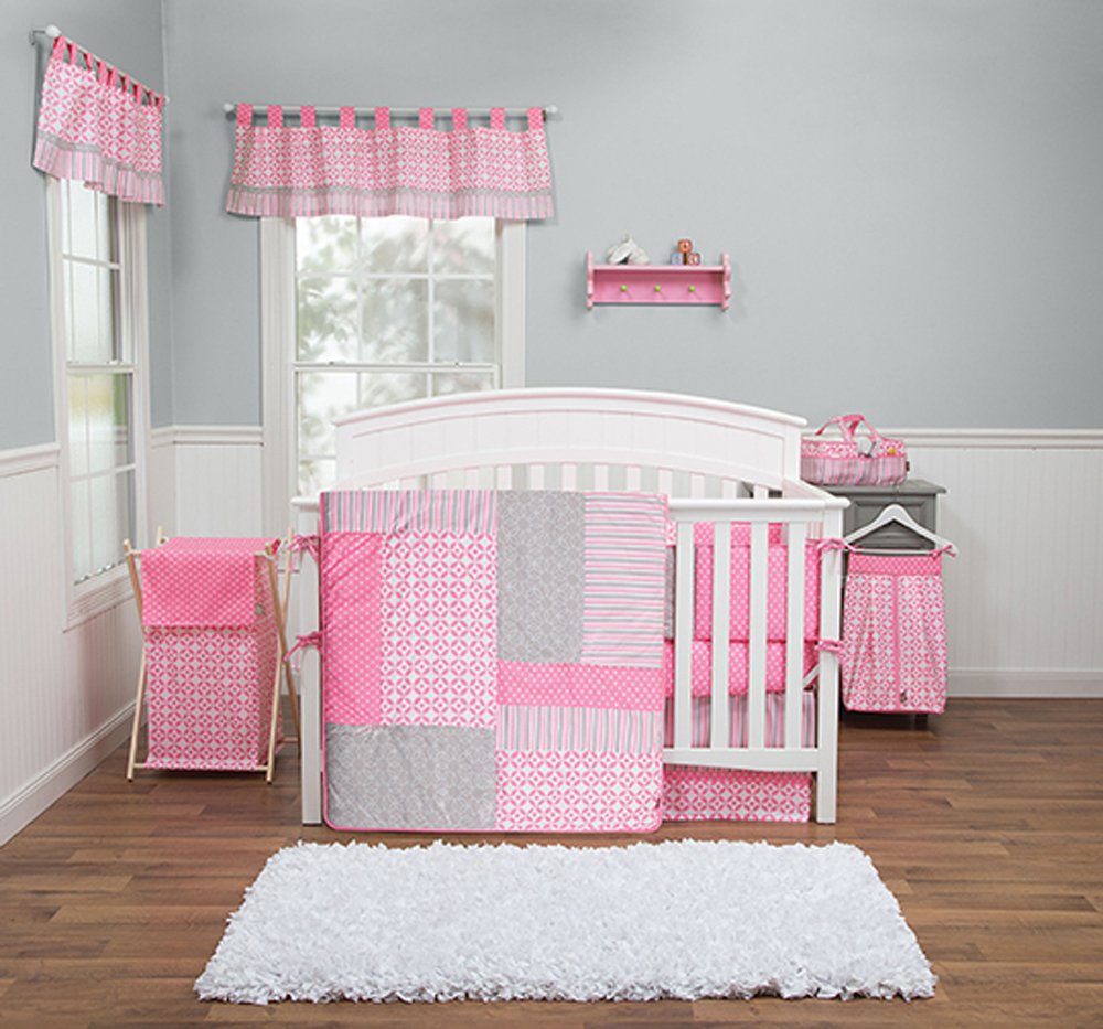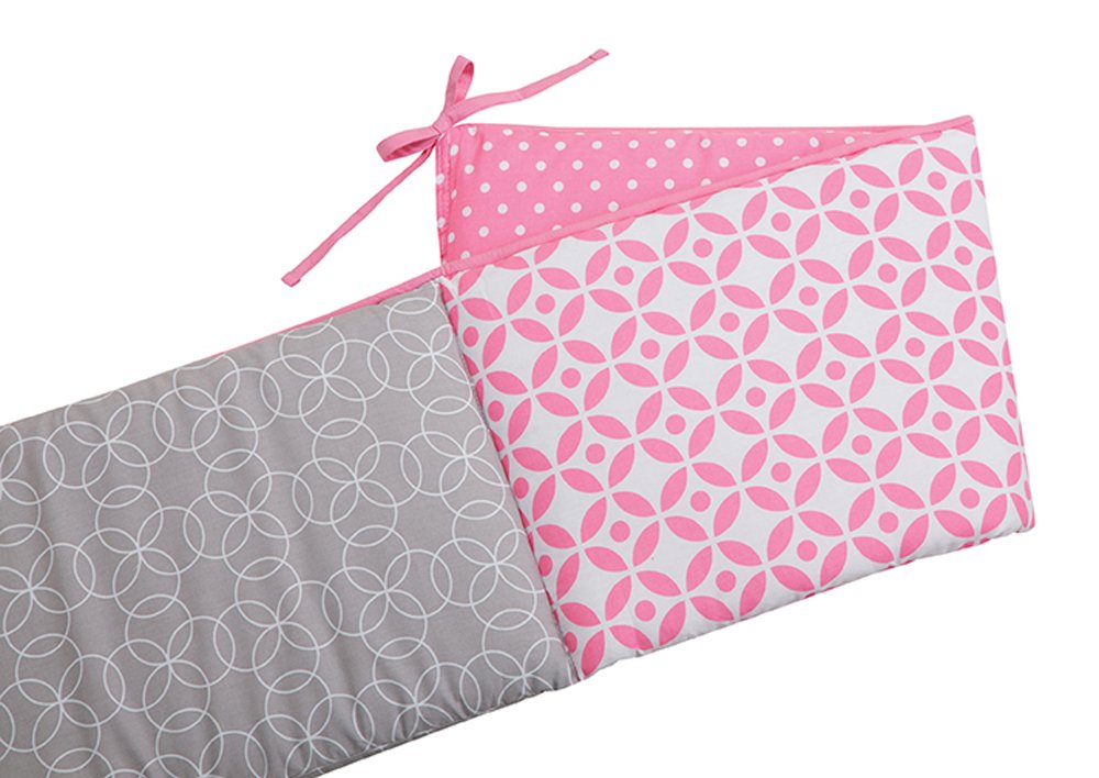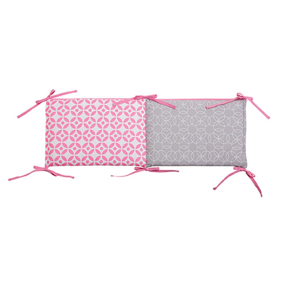 Trend Lab's Lily Crib Bumpers combine patches of stripes, dots, circular lattice and geometric circles in the wonderful color palette of poppy pink mixed with shades of opal gray and white. A charming poppy pink solid cotton adorns the trim and ties, adding the final touch. Bumpers consist of two long and two short pieces measuring 10 in tall. Coordinating Lily 3 Piece Crib Bedding, room accessories and gift items by Trend Lab sold separately.