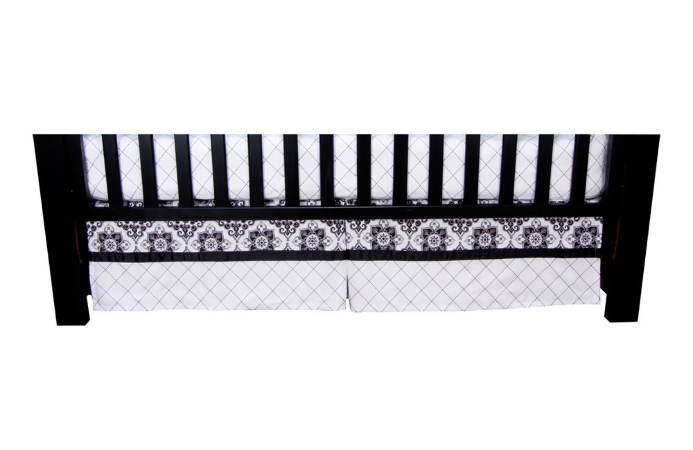 Add style and sophistication to your nursery with Trend Lab's Versailles Black & White 3 Piece Crib Bedding Set. The modern black and white colors offer high-contrast style featuring filigree motifs reminiscent of vintage damask wallpaper. Beautiful over-sized embroidery, a diamond print and black satin bring detail and finishing touches of elegance to this lovely group. Accent with fashionable colors of your choice to make the look your own. Set includes quilt, crib sheet and skirt. The quilt measures 35"" x 45"" and features a black and white damask print framed by black satin and a black and white diamond print. A large filigree embroidery inside a black satin frame at the center of the quilt brings textured elegance while a black satin trim adds the finishing touch. Black and white diamond print crib sheet has 10"" deep pockets and fits a standard 52"" x 28"" crib mattress. Elastic around the entire opening ensures a more secure fit. Box pleat skirt with 15"" drop features strips of the black and white damask and diamond prints separated by black satin. Matching Versailles Black & White Crib Bumpers sold separately. Complete your nursery with coordinating room accessories from the Versailles Black & White collection by Trend Lab.